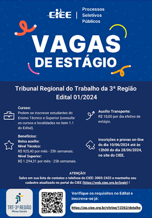 Em parceria com o Centro de Integração Empresa-Escola de Minas Gerais (CIEE/MG), O TRT-MG abre novo edital para a formação de cadastro de reserva para estágio remunerado. O público alvo são estudantes de diversos cursos de graduação e educação profissional técnica de nível médio, em diversas localidades.