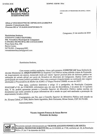 O Ministério Público de Minas Gerais (MPMG), através da 1ª Promotoria de Justiça da Comarca de Cataguases, decidiu arquivar o Inquérito Civil Público instaurado para apurar eventuais irregularidades que teriam sido praticadas pela vereadora Stefany Carli de Oliveira, do Partido dos Trabalhadores.