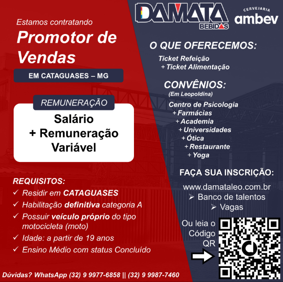 Descrição: Promotor (a) de Vendas na cidade de CATAGUASES. Vaga para todos os gêneros, cores e crenças. Procuramos por um perfil ousado, que queira sonhar grande com o time Damata. É ótimo ter: boa comunicação e curiosidade. É obrigatório ter: Ensino Médio completo, CNH categoria A definitiva e moto própria. Para sua segurança: precisamos que você resida em CATAGUASES.