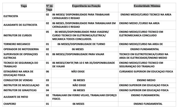 Os cargos de Instrutor de Musculação (cinco vagas) e Estagiário na Área de Educação Física (seis vagas) não precisa de experiência. Nas demais oportunidades, exige-se pelo menos seis meses de experiência no setor desejado.