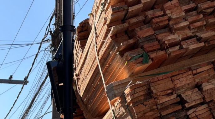 O veículo danificado quebrou uma mola mestra da roda dianteira direita. Com isso ele ficou inclinado para a direita e a carga encostou nos postes de iluminação pública e do semáforo. Não há informações se foram danificados.