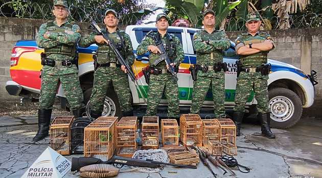A ação foi desencadeada após o recebimento de duas denúncias anônimas (DDU), que relataram a prática de caça ilegal, captura de pássaros silvestres e porte ilegal de arma de fogo no local.