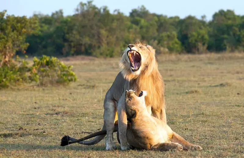 O comportamento da fêmea inclui táticas visuais e sonoras para estimular o parceiro. Ela caminha à frente dele, roça o corpo no do macho e, se necessário, utiliza vocalizações específicas e até rugidos agressivos para impedir que o ciclo seja interrompido. Para o leão, não há opção de recusa; a "lua de mel" na savana é uma ordem, não um convite.