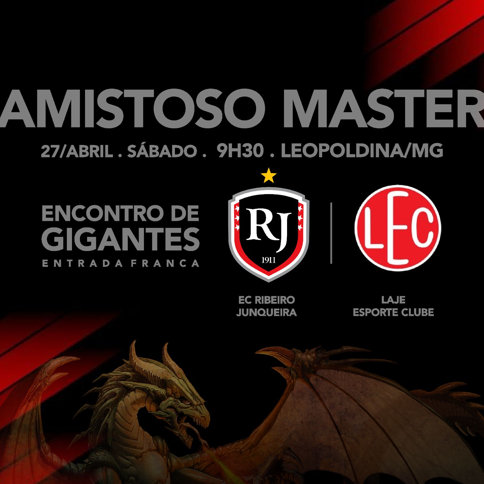 No sábado (27 de abril), será realizado um Amistoso entre as equipes da categoria Master do Ribeiro Junqueira e do Laje Esporte Clube.