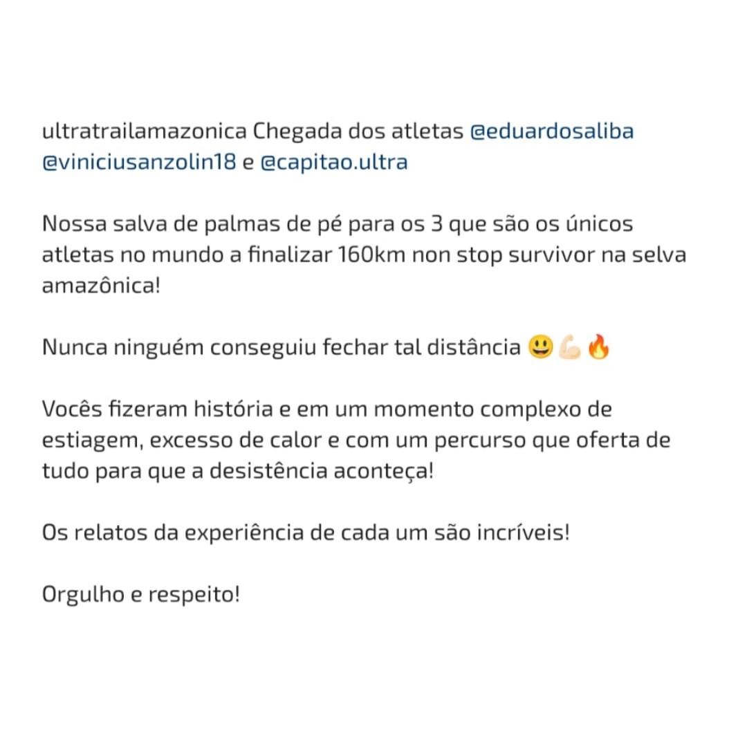 “Nenhuma outra corrida de minha vida se compara a essa experiência na selva. Passei por lugares difíceis de descrever: um calor diferente, úmido (sensação térmica de 50°); areia fofa, mata fechada com animais silvestres e uma beleza inigualável com seus rios, cachoeiras e comunidades acolhedoras”, afirma.